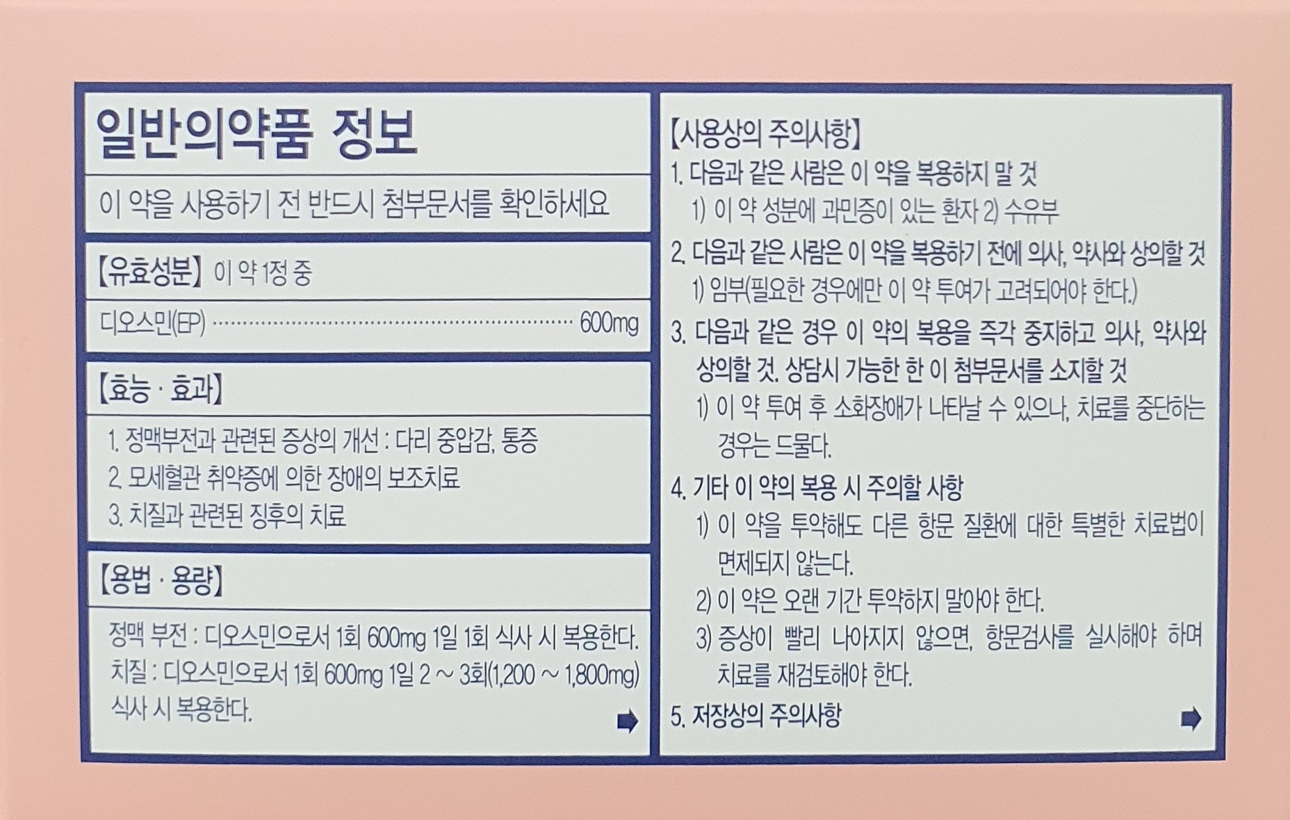 어떤 질환에 디오스민을 사용하느냐에 따라 용량, 용법이 달라지기 때문에 이를 구별하여 복용하시기 바랍니다.